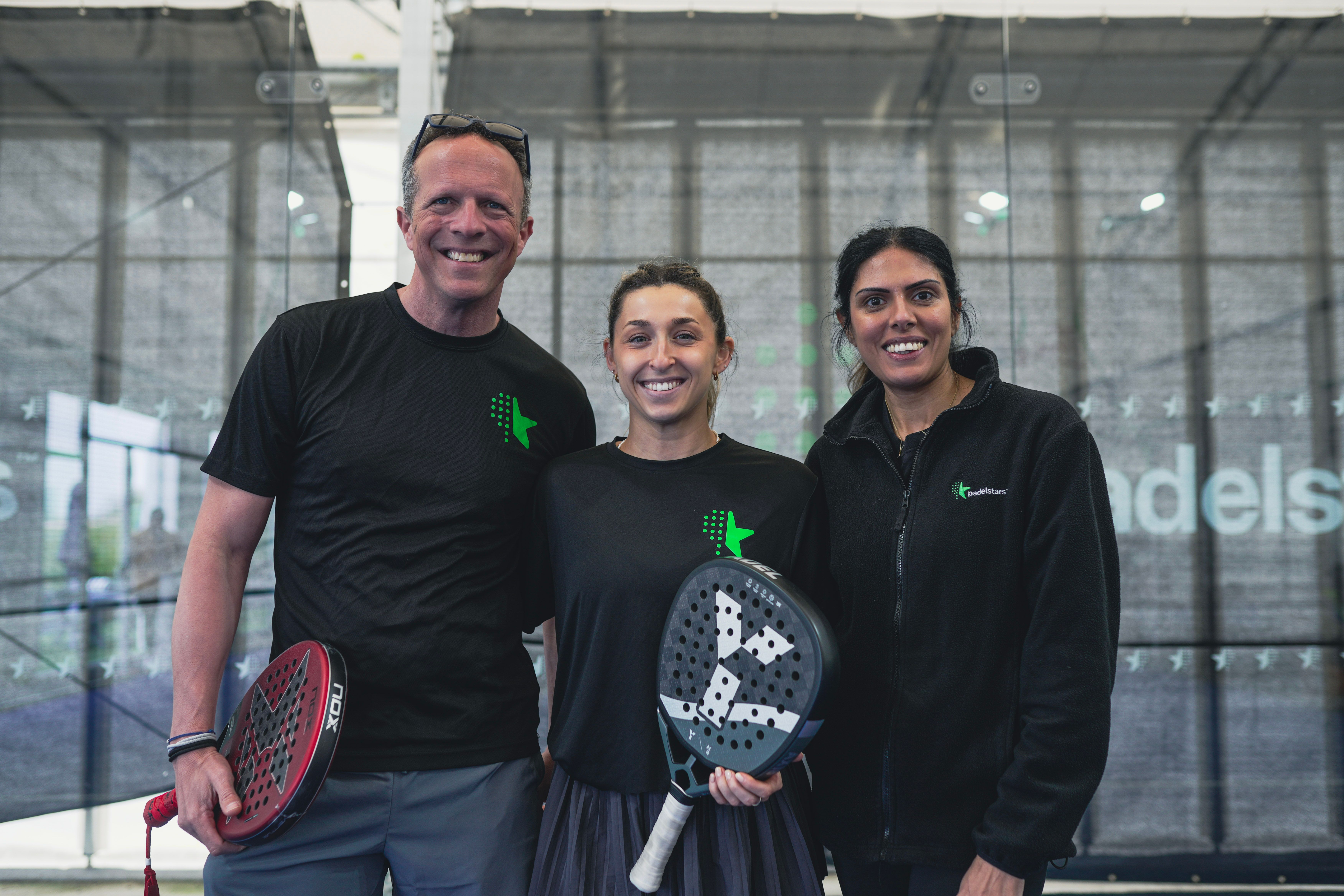 Ellie Tait (centre) with PadelStars founder Andy Knee (left) and COO Jeevan Gill (right). Image credit: PadelStars.